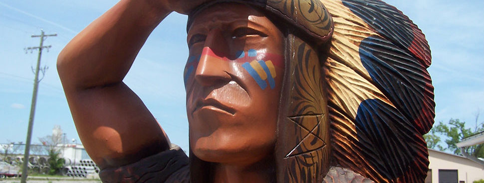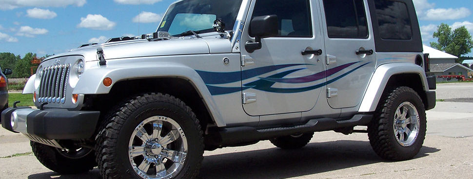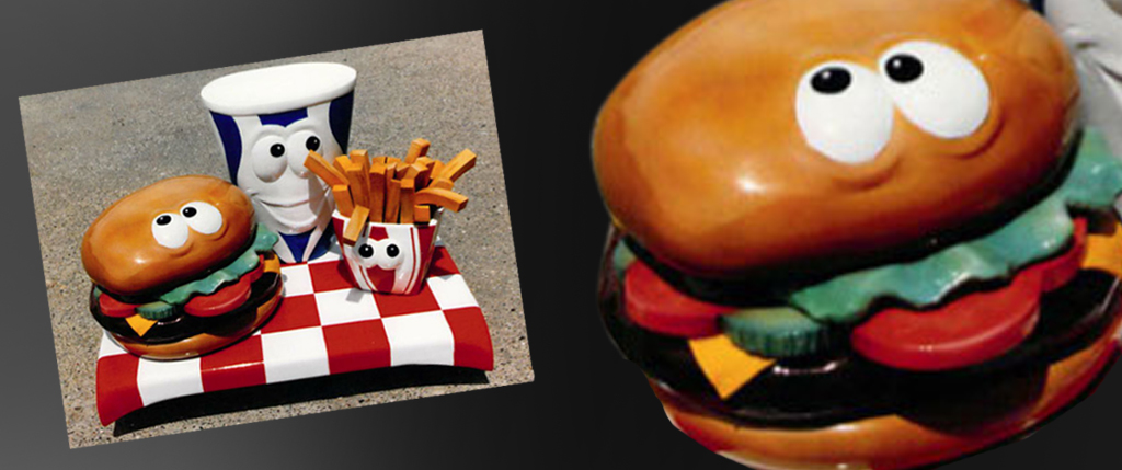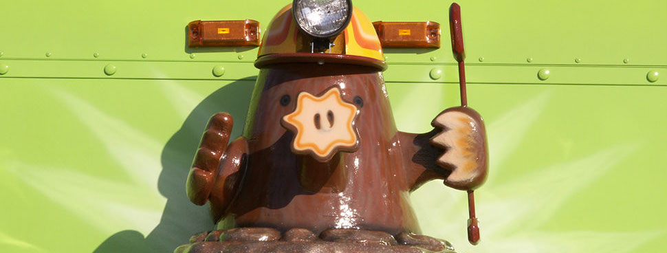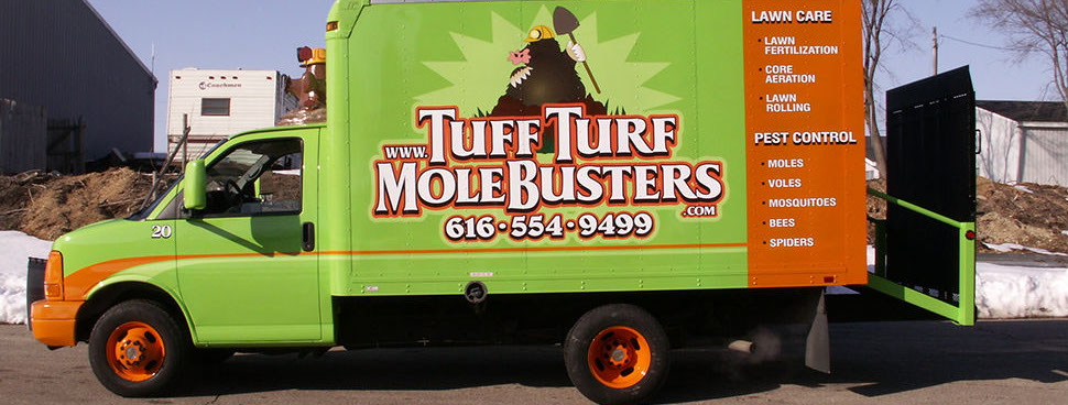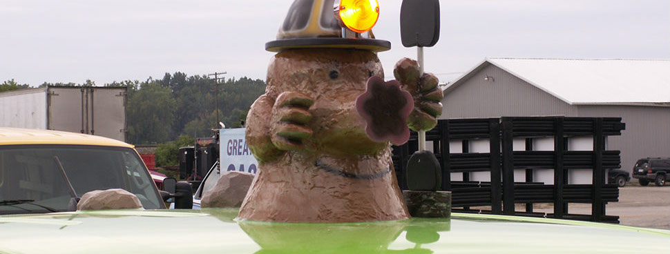 Local lawn co. "Tuff Turf Molebusters" carved moles mounted to all vehicles' roofs.